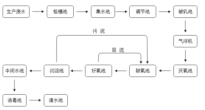 (1)預處理:廢水進入格柵池通過格柵截留大顆粒物質,再自流入調節(jié)池以平衡水質水量,使廢水均勻進入后續(xù)處理單元;